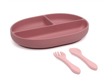 Kiokids set posate e vassoio blw in silicone con scomparti e ventosa rosa