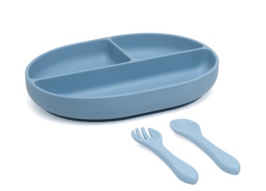 Kiokids set posate e vassoio blw in silicone con scomparti e ventosa azzurro